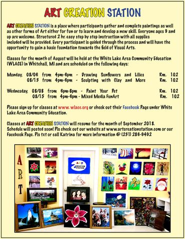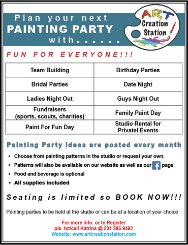 We provide friendly and easy to follow instructions and welcome guests with little or no experience. So if you are looking for something new to try for a fun evening for yourself, with friends or family, come to Art Creation Station and paint the day or night away! =)